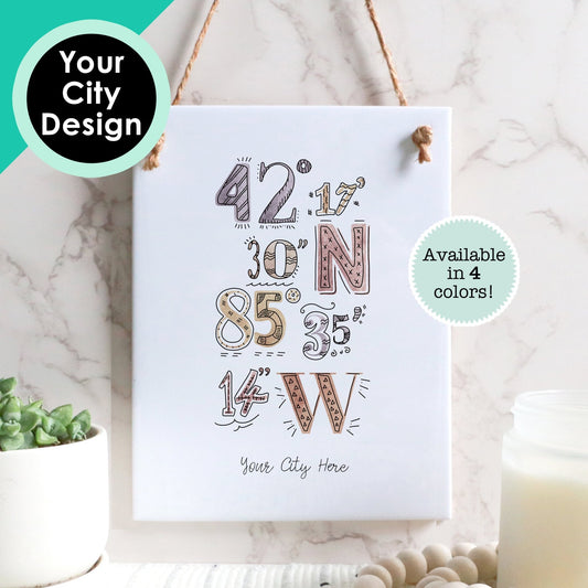 Custom City Art Tile Sign - Watercolor Coordinates Drawing For Your Hometown - Rectangle