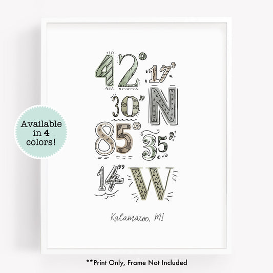 Kalamazoo MI City Art Print - Watercolor Coordinates - City Drawing Michigan Souvenir