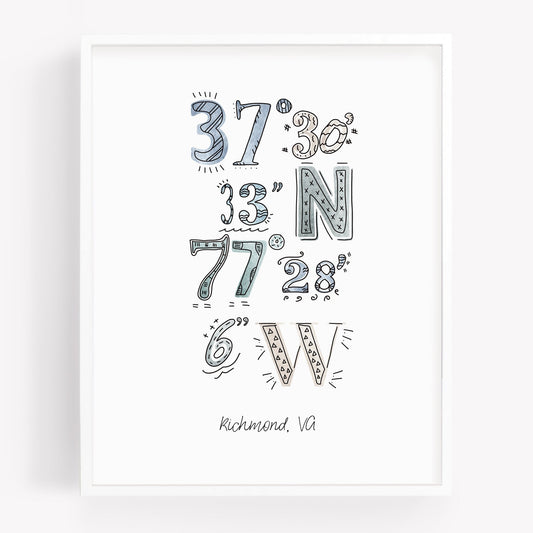 Richmond VA City Art Print - Watercolor Coordinates - City Drawing Virginia Souvenir