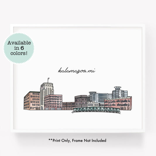 Kalamazoo MI Illustrated Art Print - Skyline Drawing - City Drawing Michigan Souvenir
