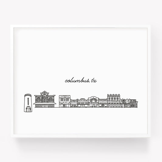 Downtown Columbus TX Illustrated Art Print - Skyline Drawing - City Drawing Texas Souvenir