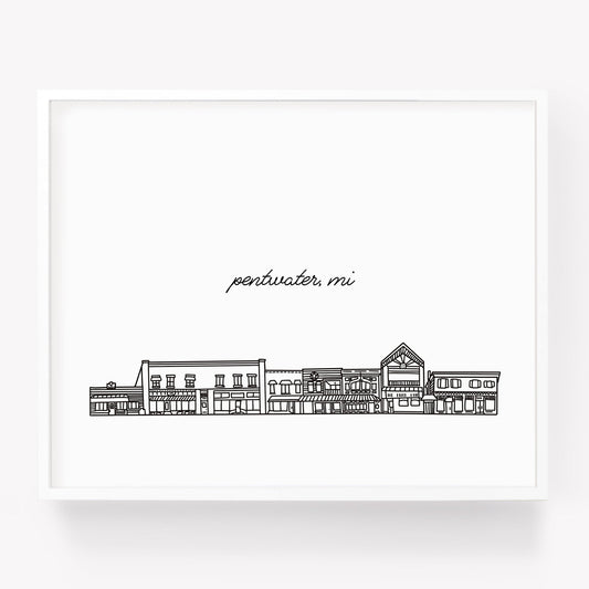 Pentwater MI Illustrated Art Print - Downtown Drawing - Skyline Drawing - City Drawing Michigan Souvenir
