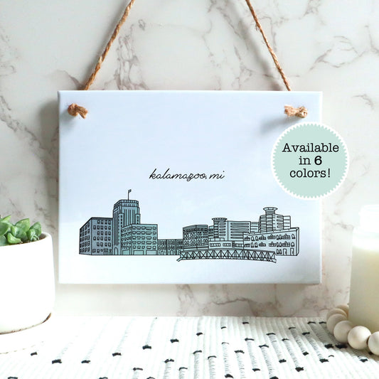 Kalamazoo MI Illustrated Art Tile Sign - Skyline Drawing - City Drawing Michigan Souvenir - Rectangle