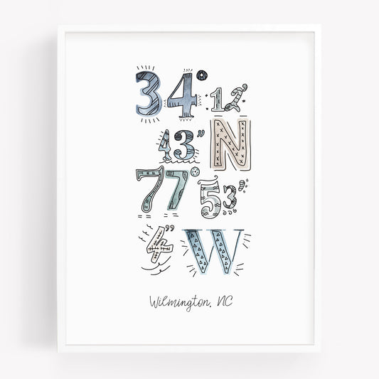 Wilmington NC City Art Print - Watercolor Coordinates - City Drawing North Carolina Souvenir